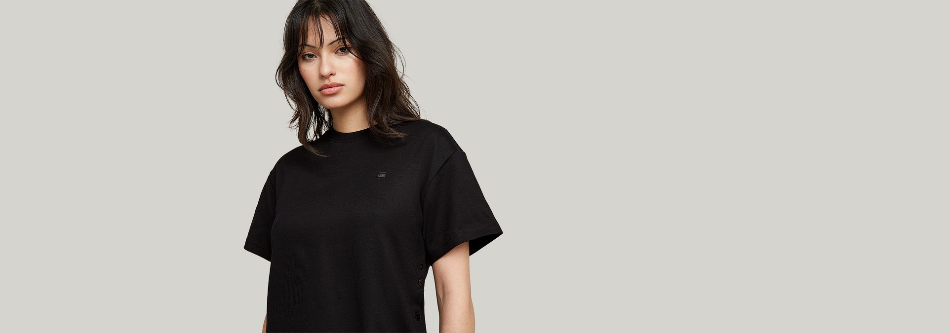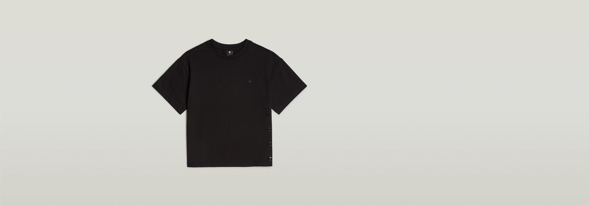 El top Side Buttons Relaxed tiene un corte recto y una abertura pronunciada en un lateral. Los botones a presión permiten cerrarla parcialmente o del todo.