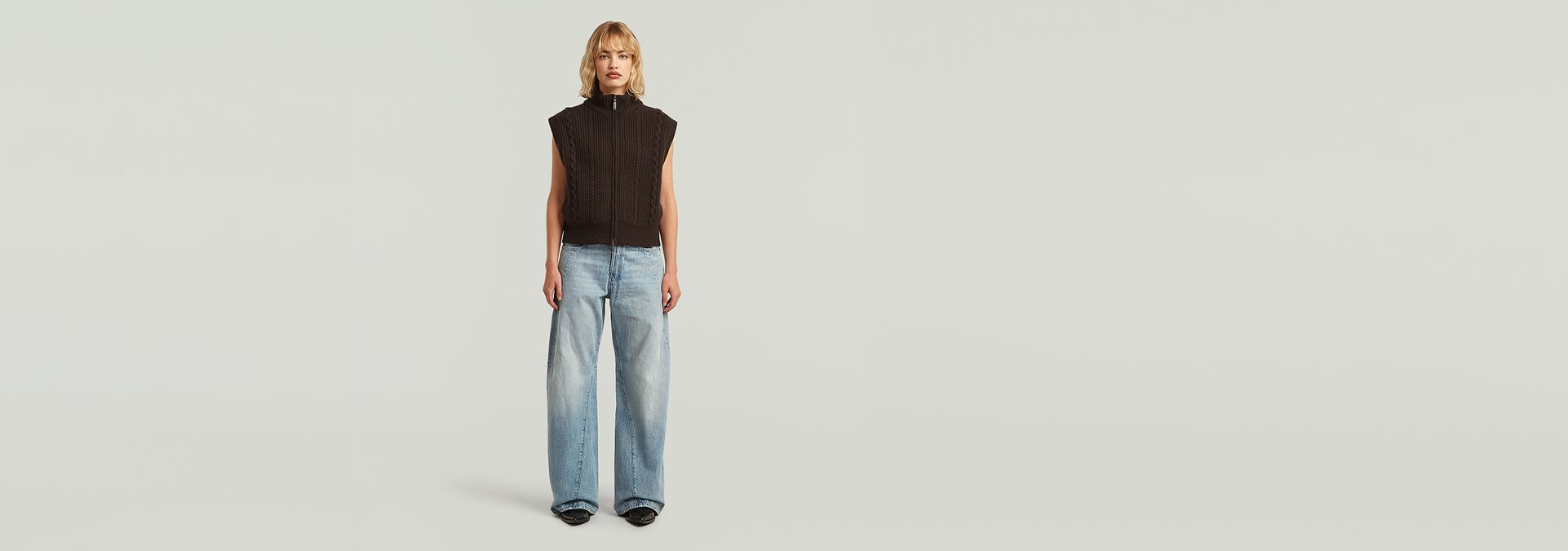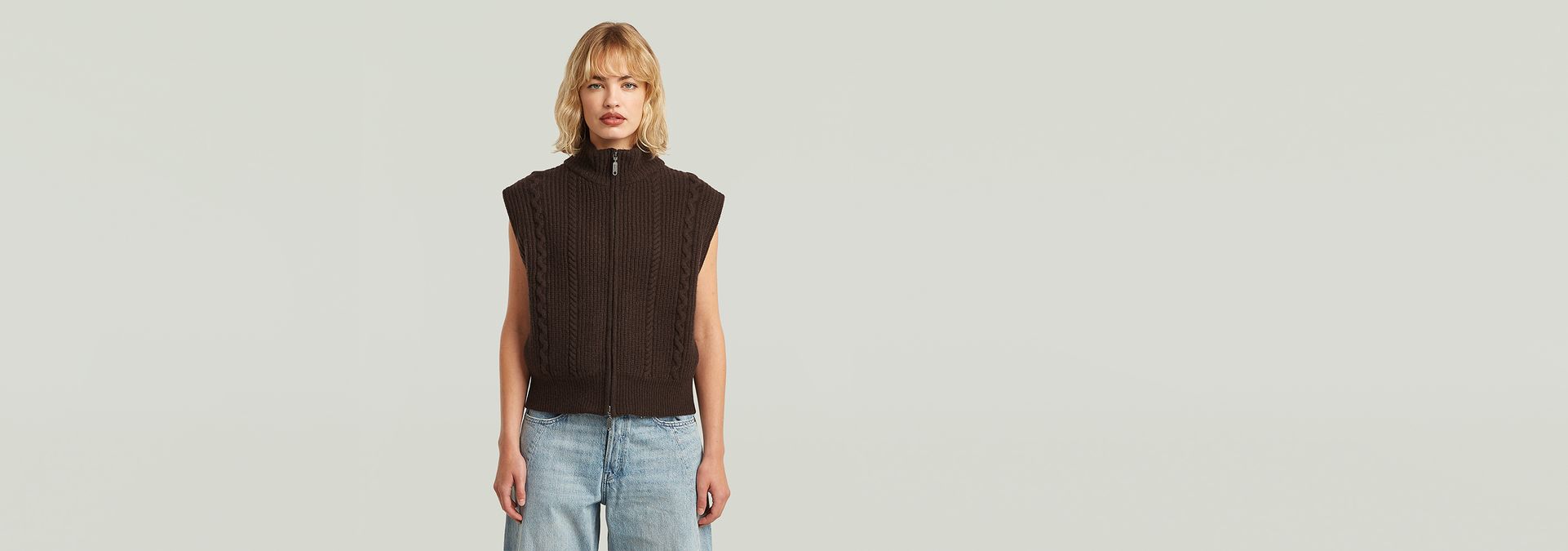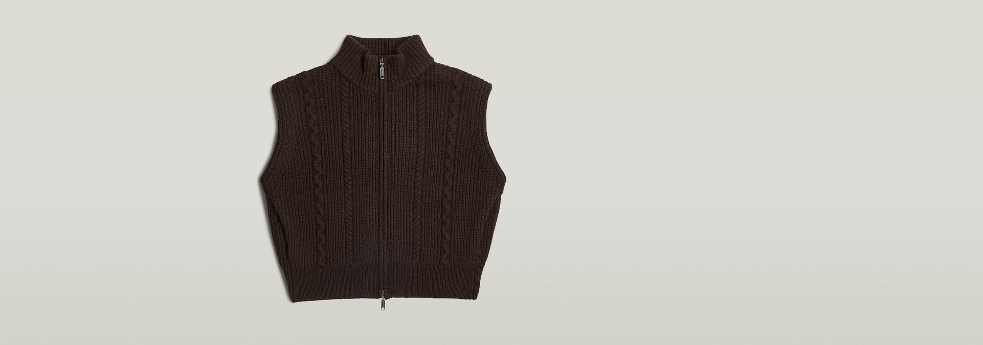 El chaleco de punto Cable Full Zip luce un corte regular con una cintura recortada, ofreciendo un diseño sin mangas.