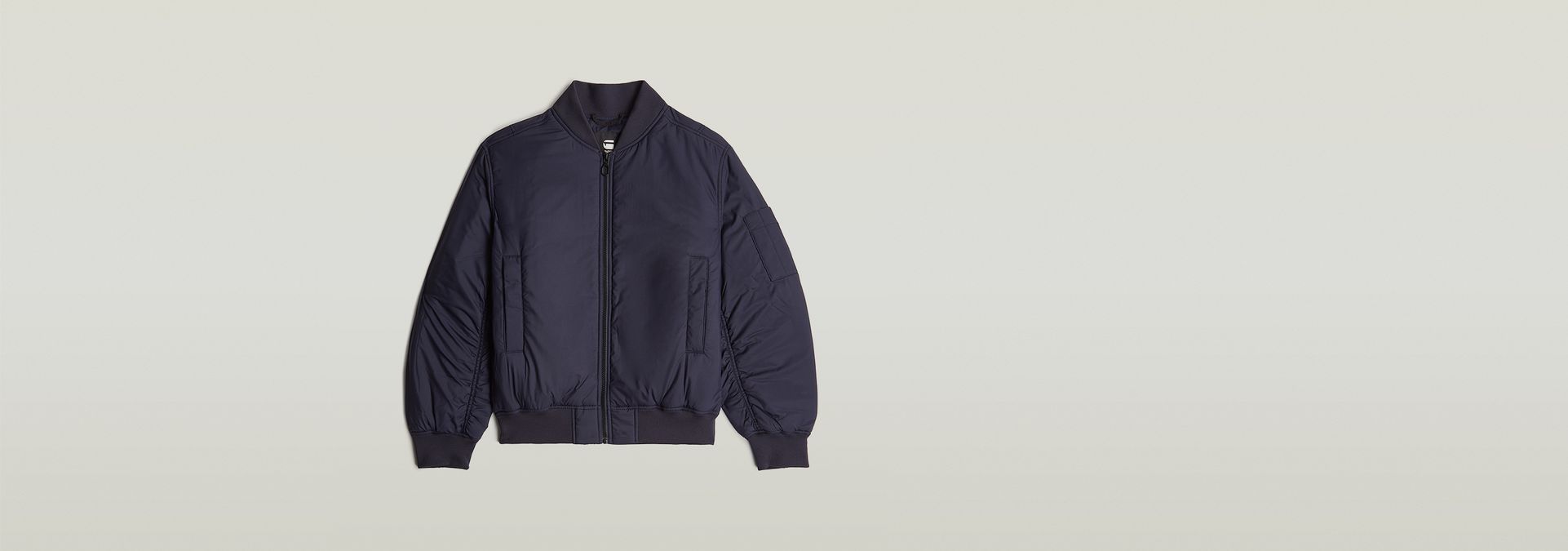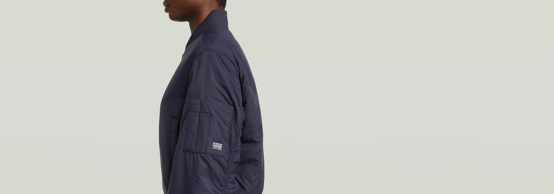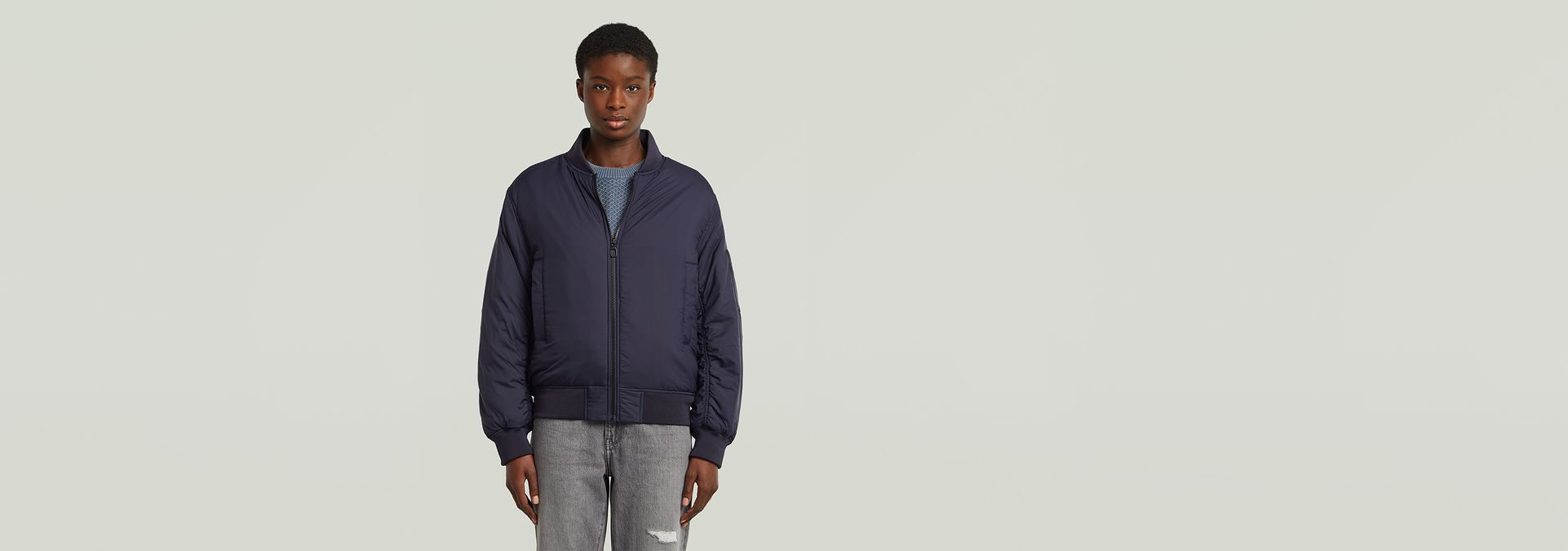La cazadora bomber Padded tiene un largo recortado, cierre de cremallera, bolsillos con ribete en la cintura y un bolsillo en la parte superior de la manga con múltiples inserciones. La costura fruncida en la parte trasera de la manga añade detalle.