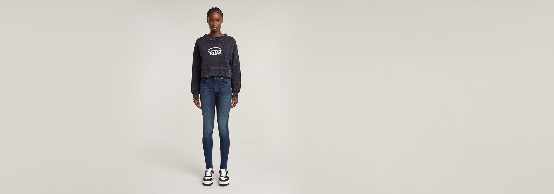 La modelo mide 1.78m y lleva una talla 27/32 (cintura 62cm, caderas 89cm). Guía de tallas