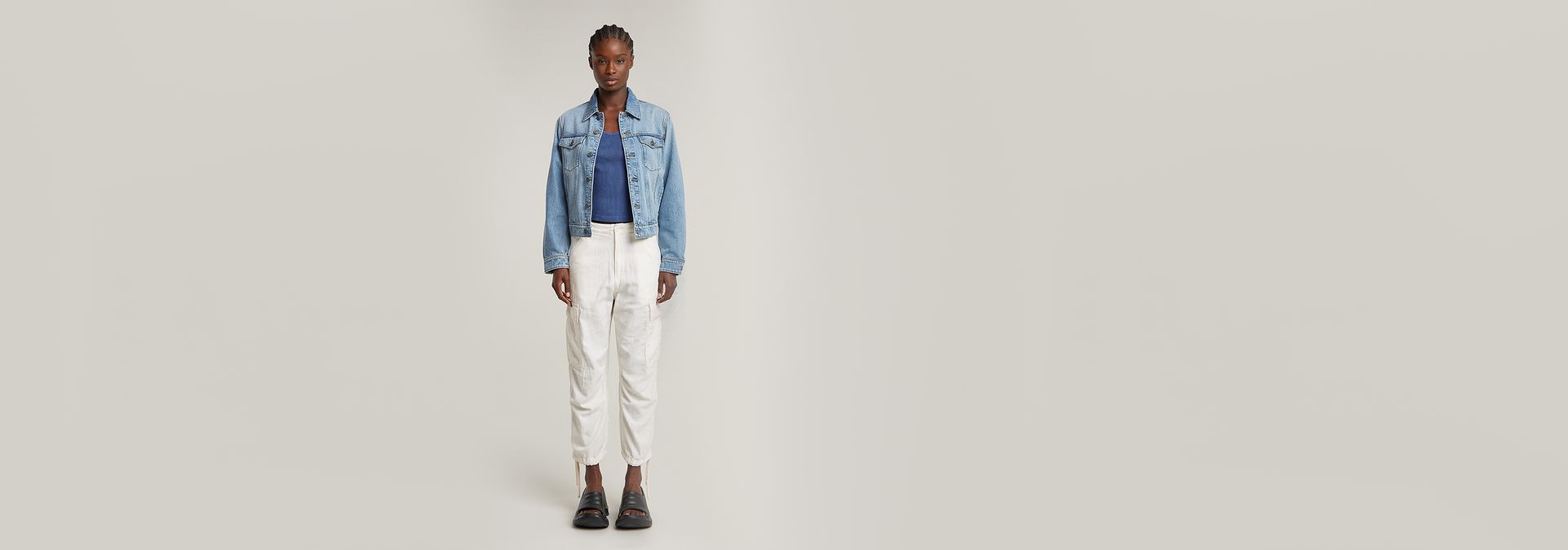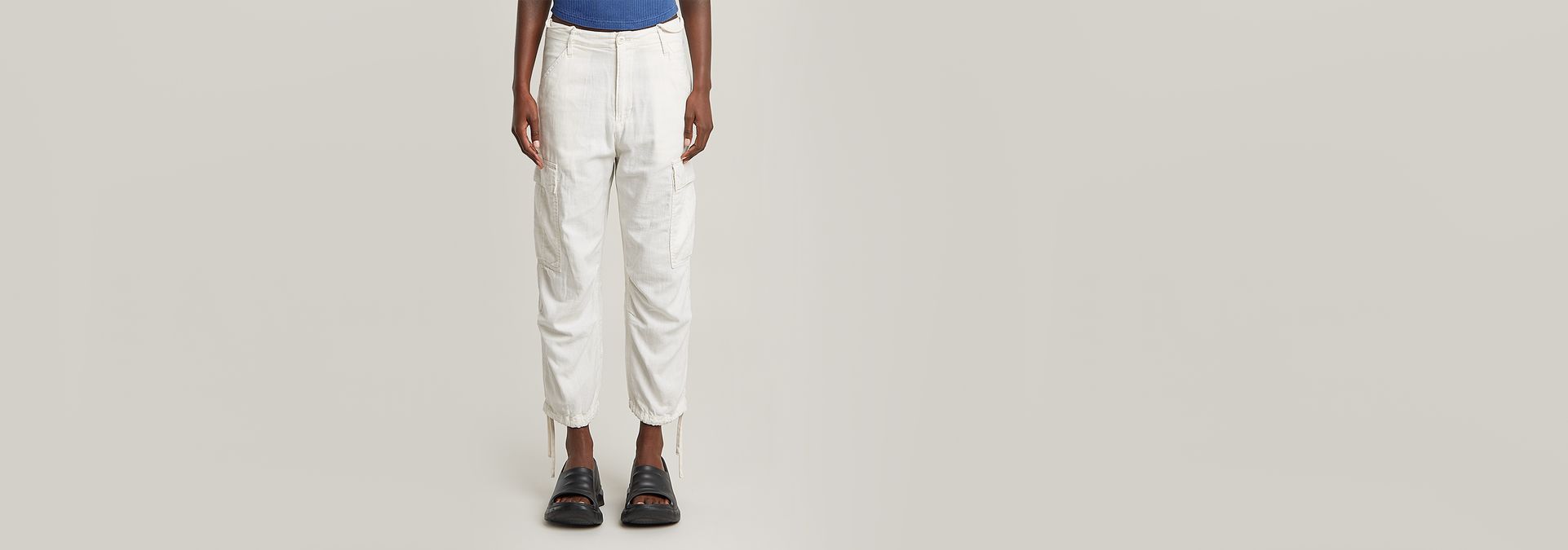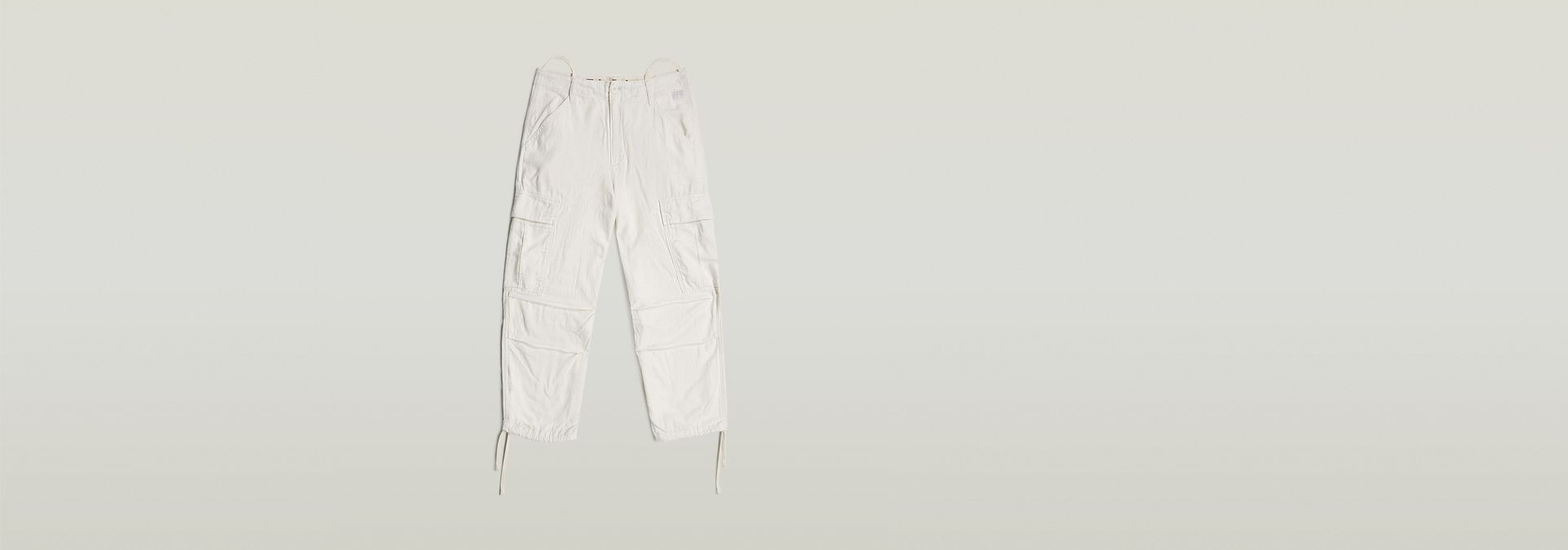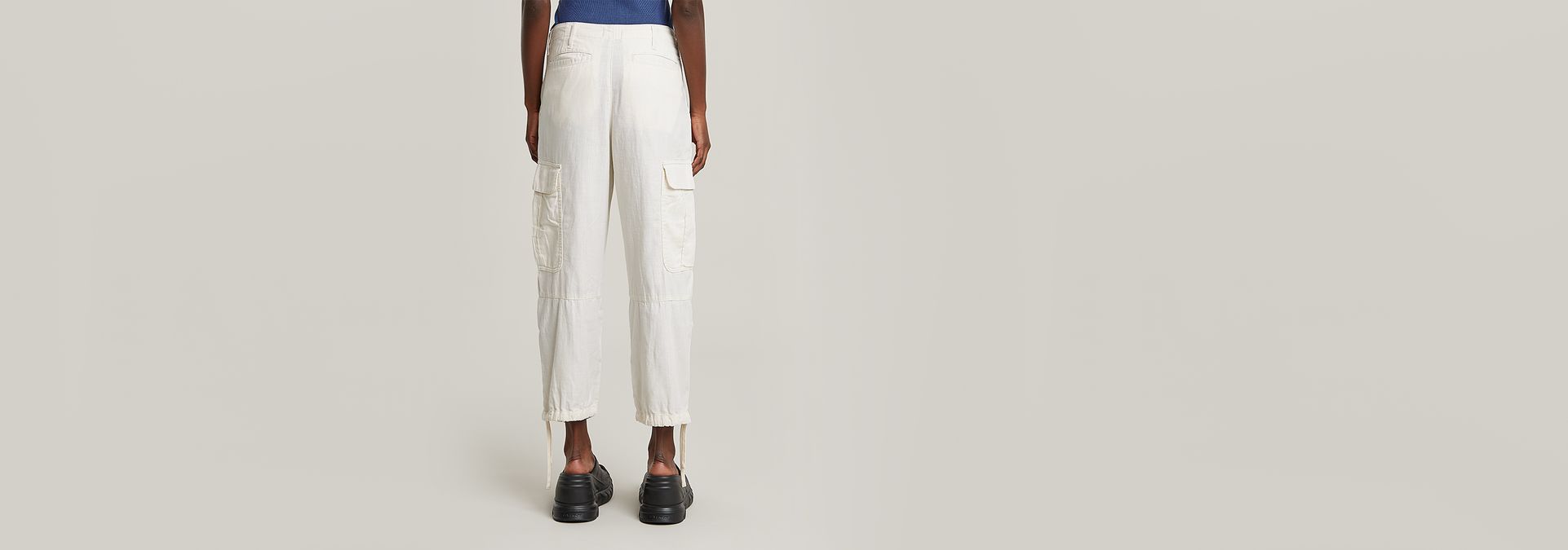 Los pantalones Cargo Cropped tienen corte recto con el largo acortado. Las cintas del bajo permiten ceñirlo, mientras que los pliegues de la rodilla aportan más forma. La trabilla en la cintura aporta un detalle interesante.