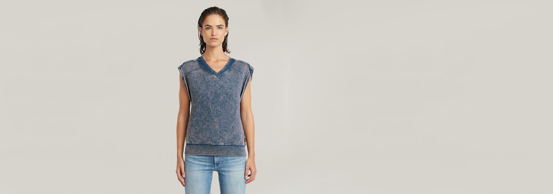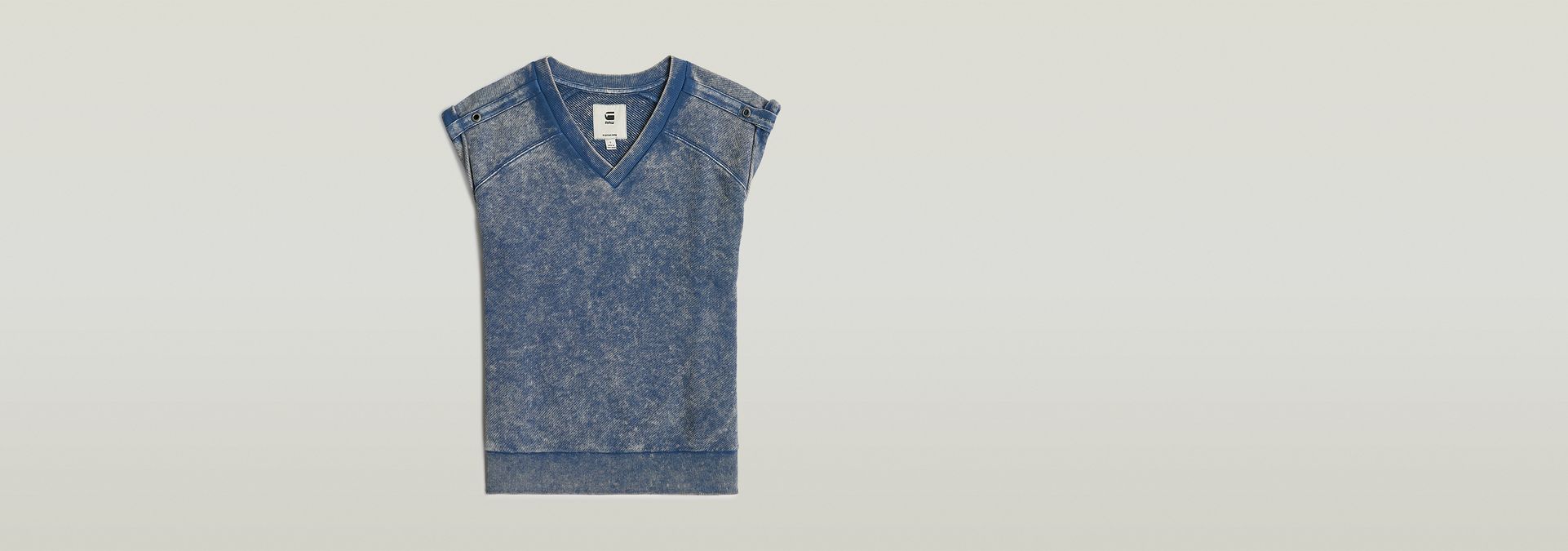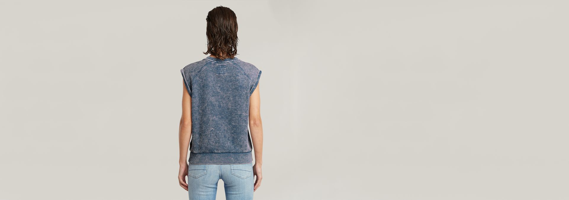La sudadera sin mangas efecto lavado es una prenda de corte recto. Las mangas cortas están enrolladas y fijadas con un remache y la cintura está rematada con un borde acanalado.