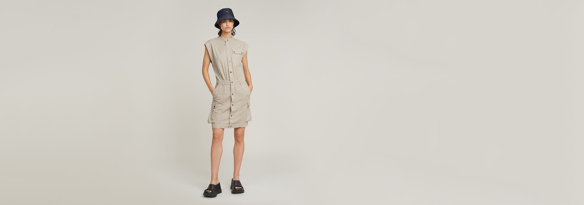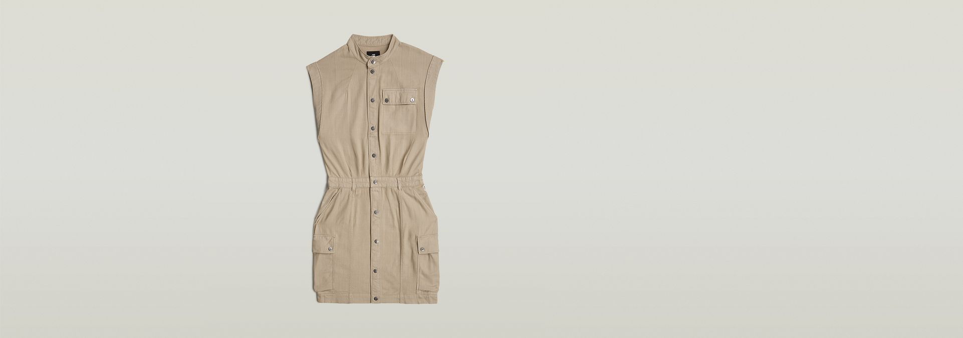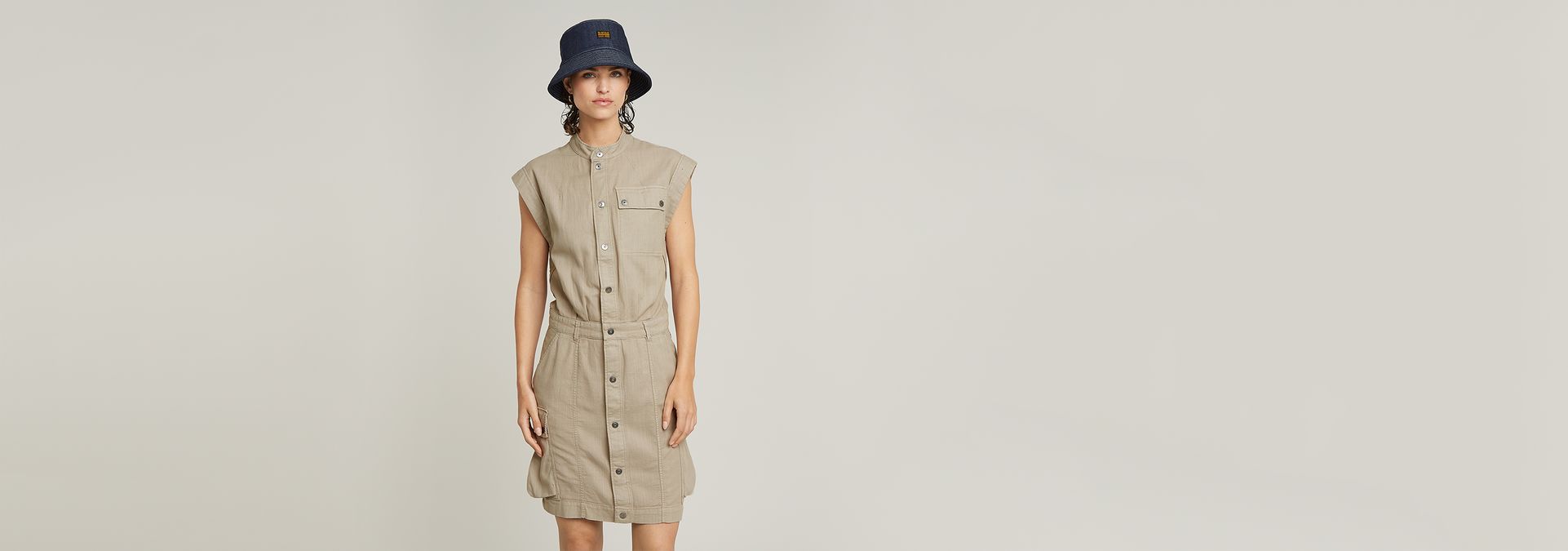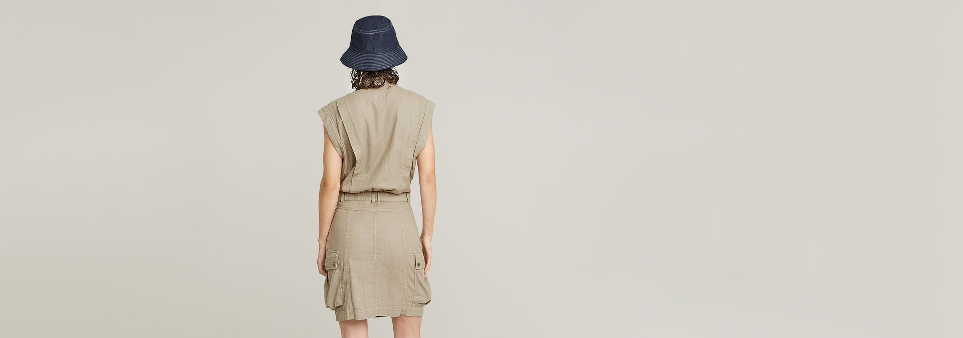 El vestido tipo pocket tiene un diseño de corte recto que va hasta la rodilla. Los hombros están ensanchados y rematados con ribetes anchos. Lleva bolsillos con solapa y botones a presión en el pecho y en el muslo. Las trabillas permiten crear un modelo con cinturón.