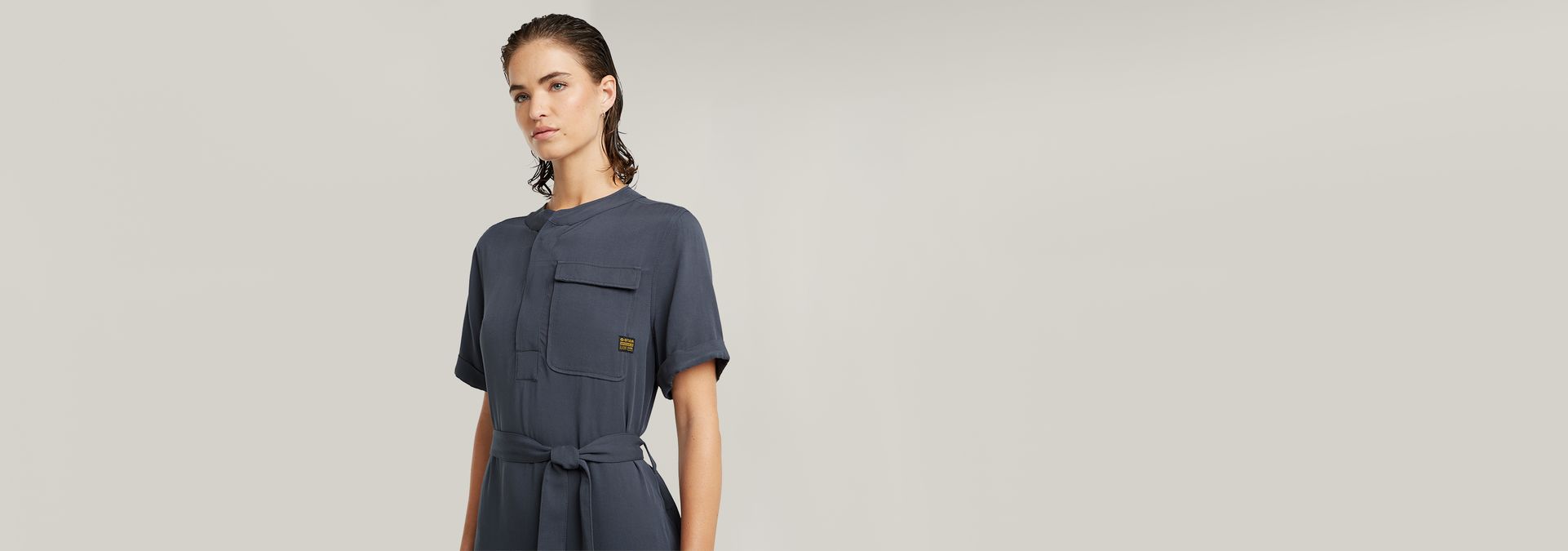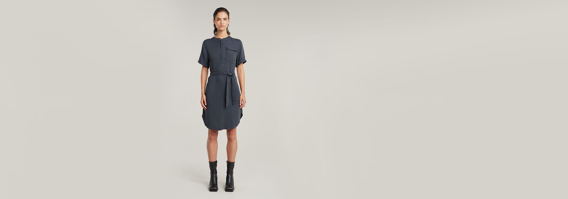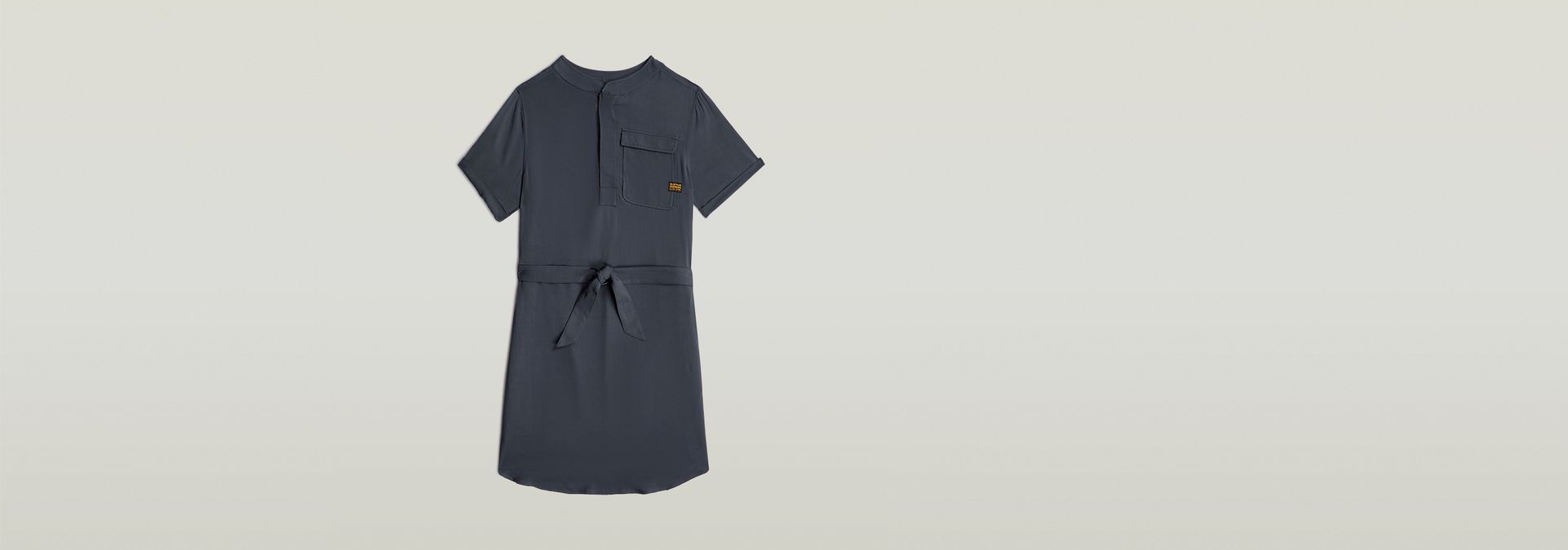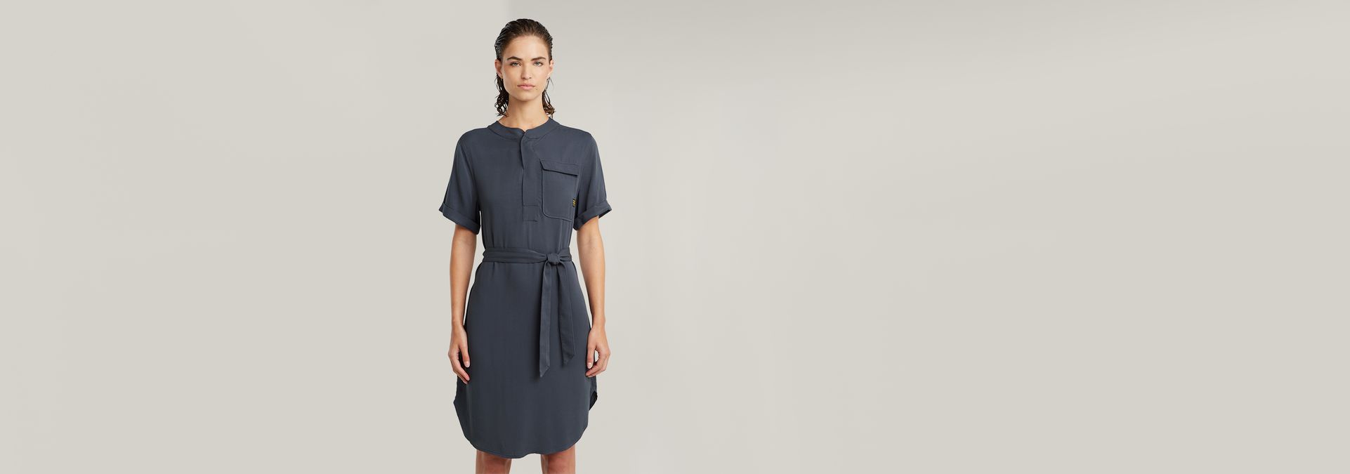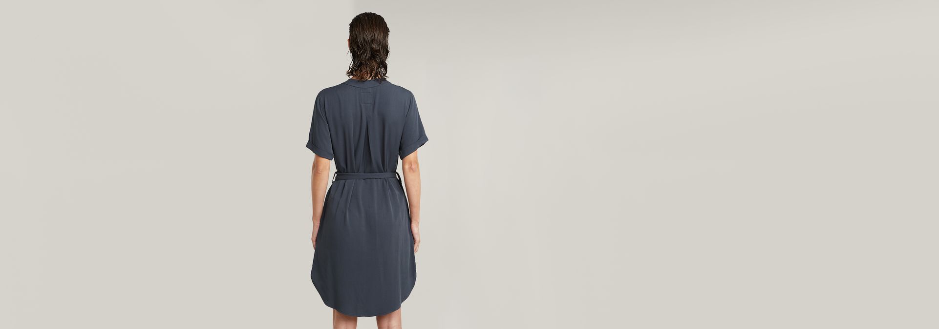 El vestido con cinturón tiene un largo por la rodilla y un bolsillo con solapa en el pecho, bolsillos en las costuras laterales, un pliegue para dar volumen en la espalda y un cinturón tejido.