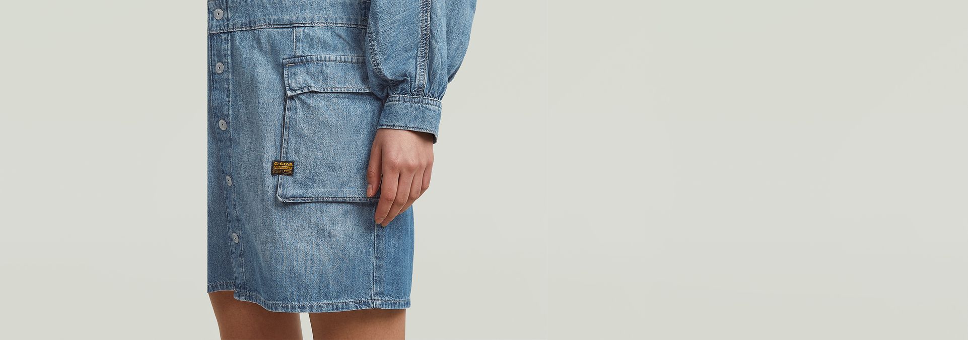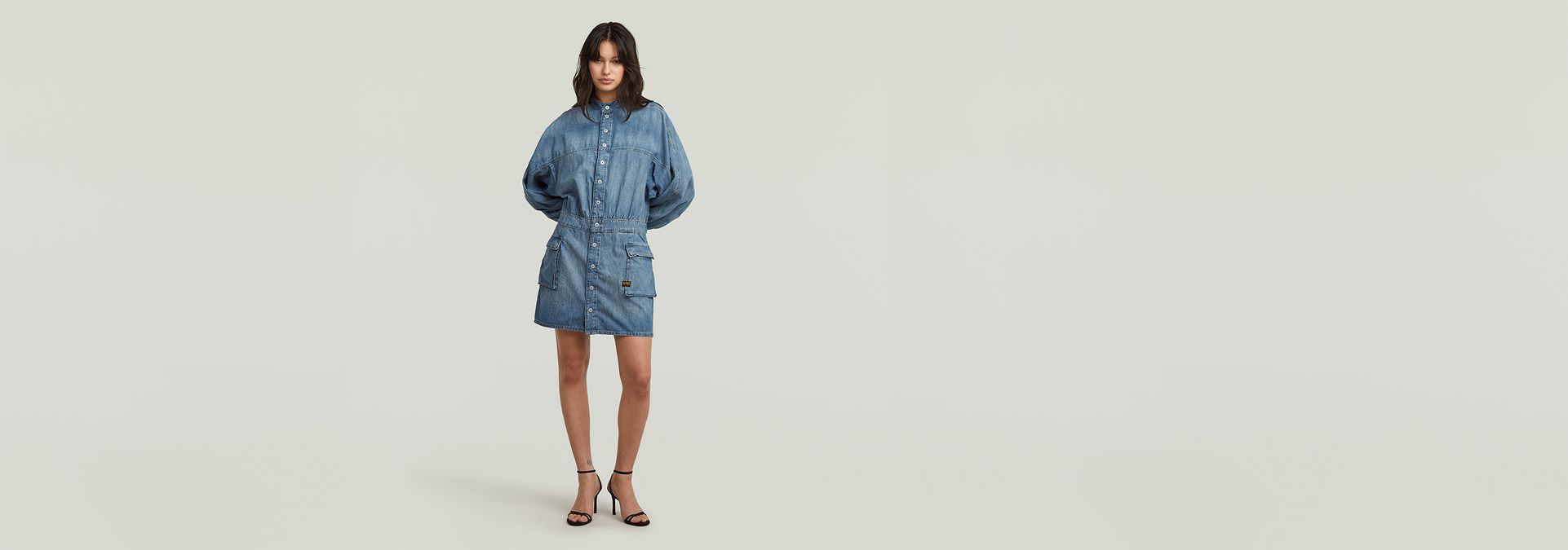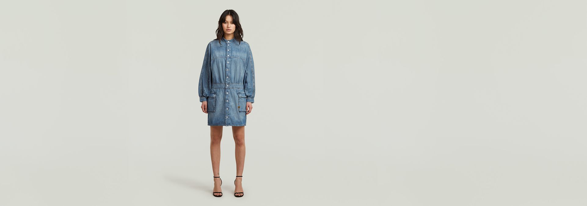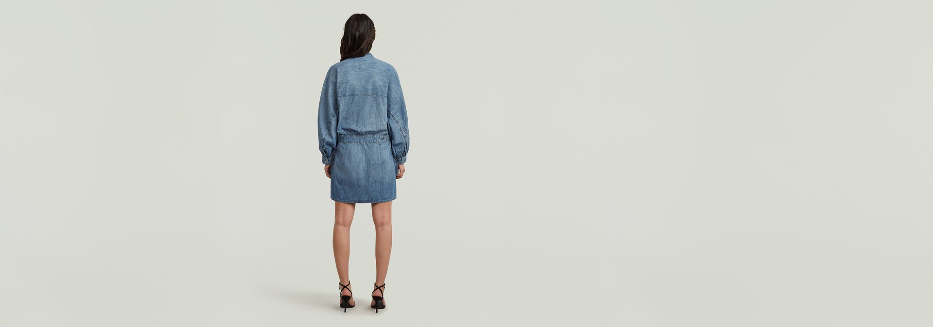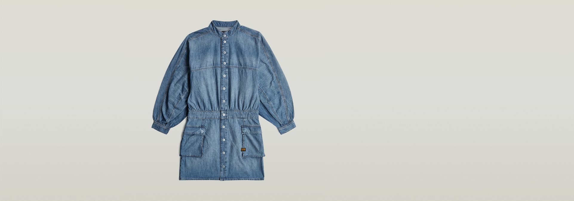 El vestido Macro Balloon tiene mangas con volumen y un largo acortado. El panel bajo del hombro realza el corte holgado. Usa las lengüetas para darle forma a la cintura. Este vestido denim combina un cuello mao con un cierre de botón a presión. Otro detalle son los bolsillos con solapa en 3D, que se cierran con botones a presión ocultos.