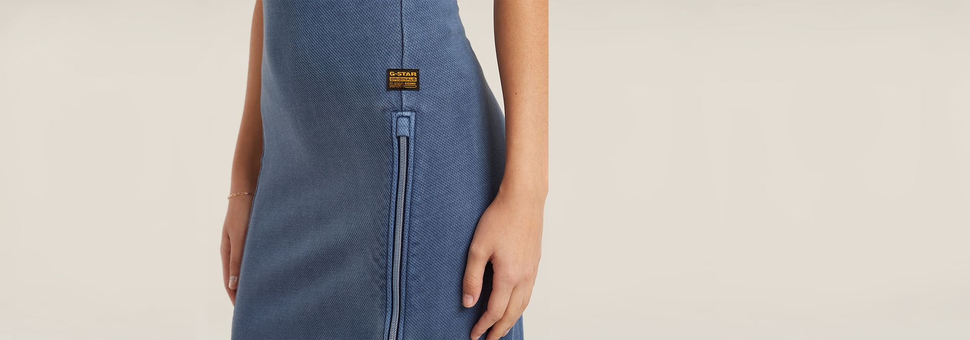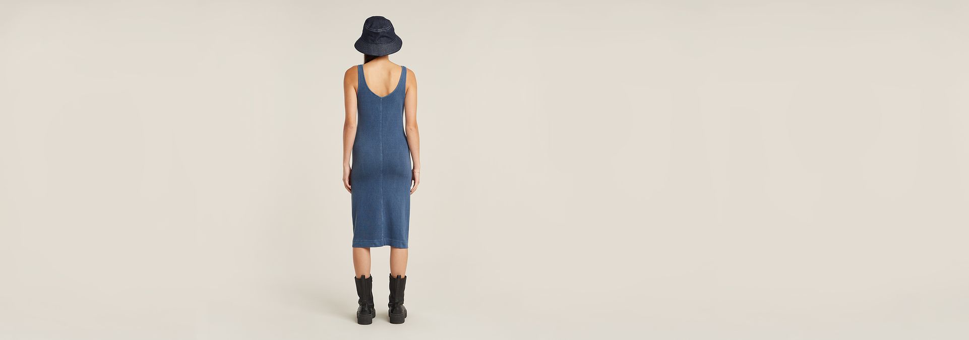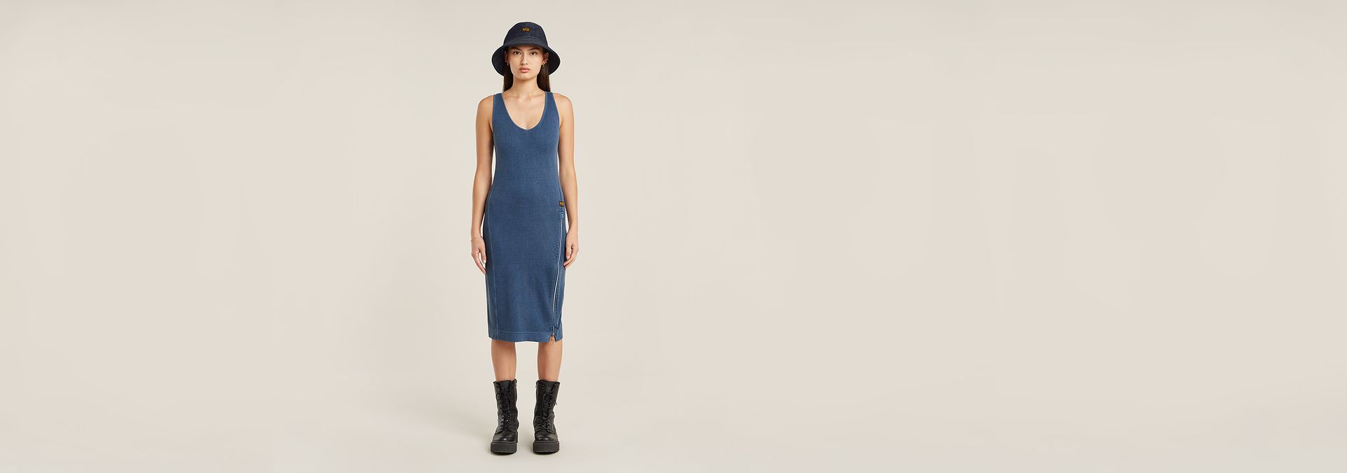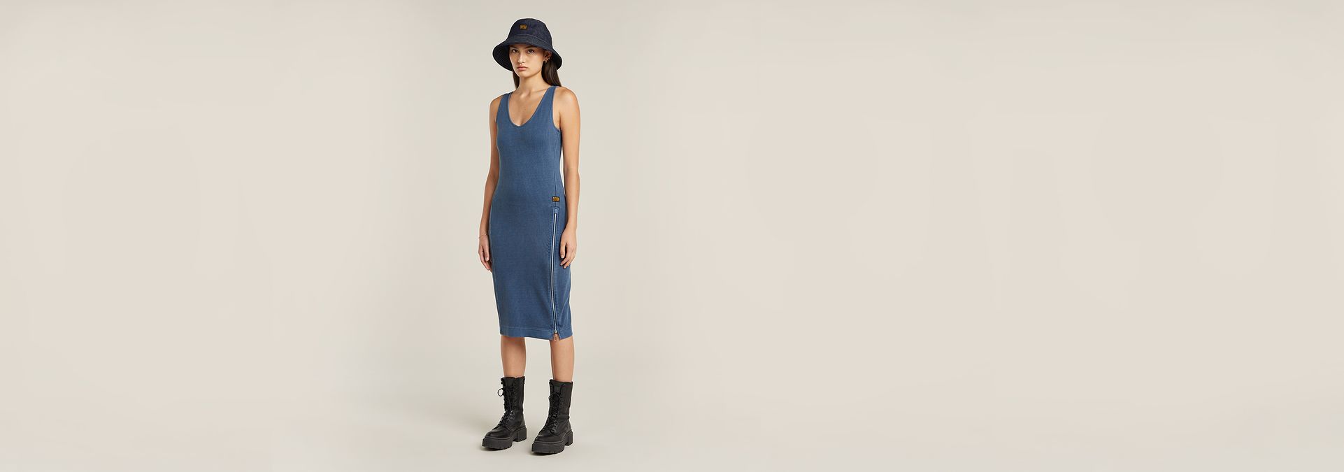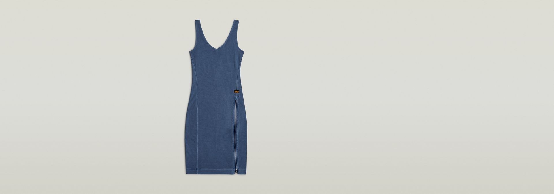 El vestido sobreteñido con cremallera asimétrica tiene un corte ajustado y cuello de pico por delante y por detrás. Este vestido sin mangas llega hasta la rodilla y lleva una cremallera en la parte inferior delantera. Desabrocha la cremallera para crear una abertura. Lleva una costura vertical en la parte trasera.