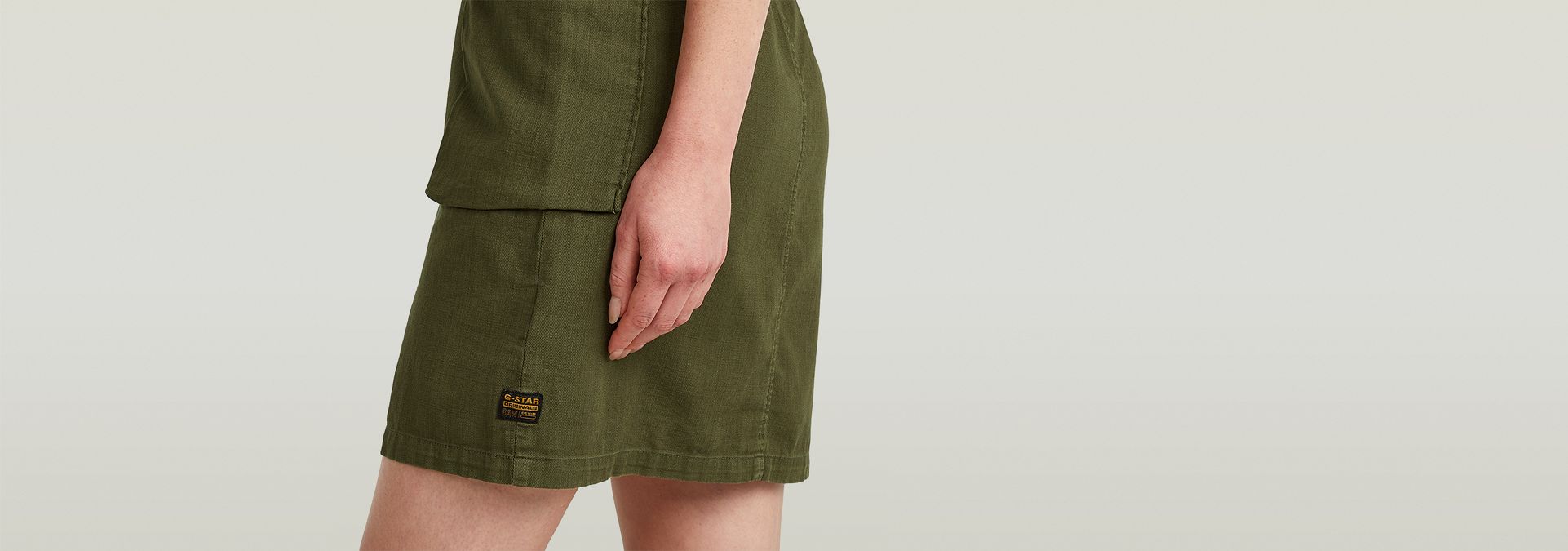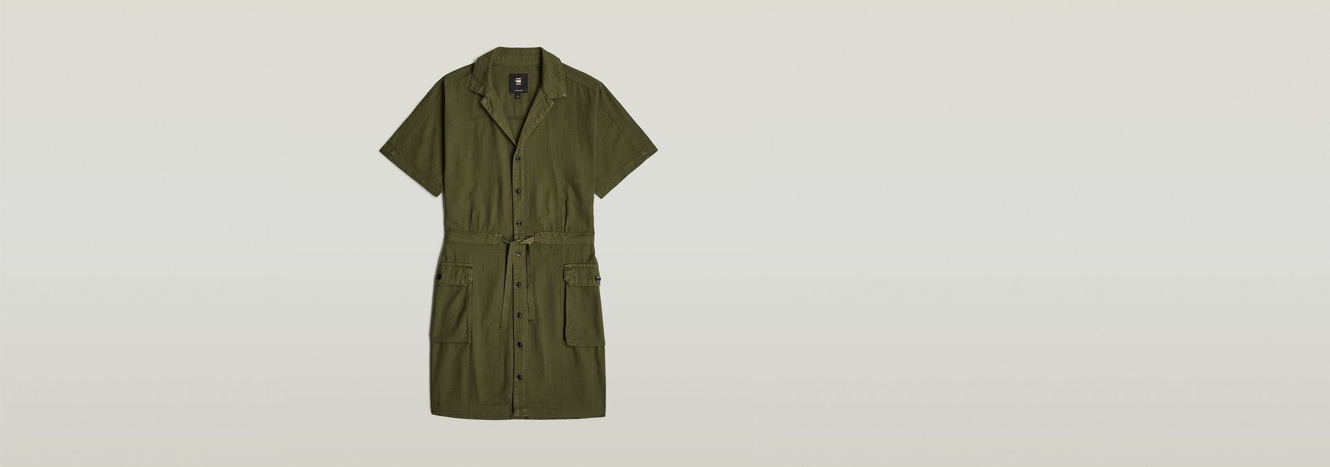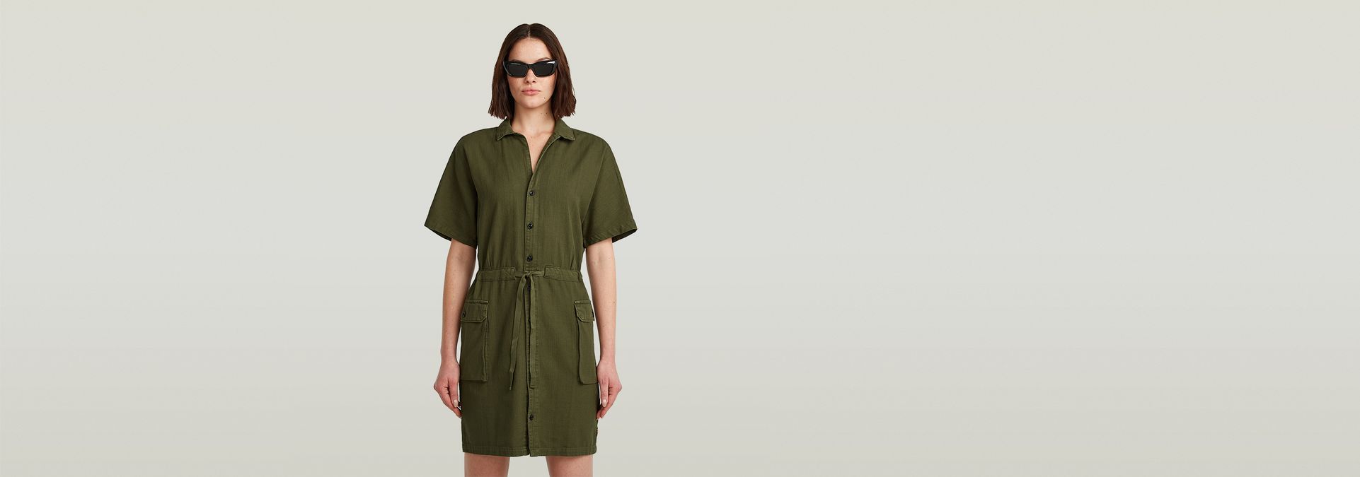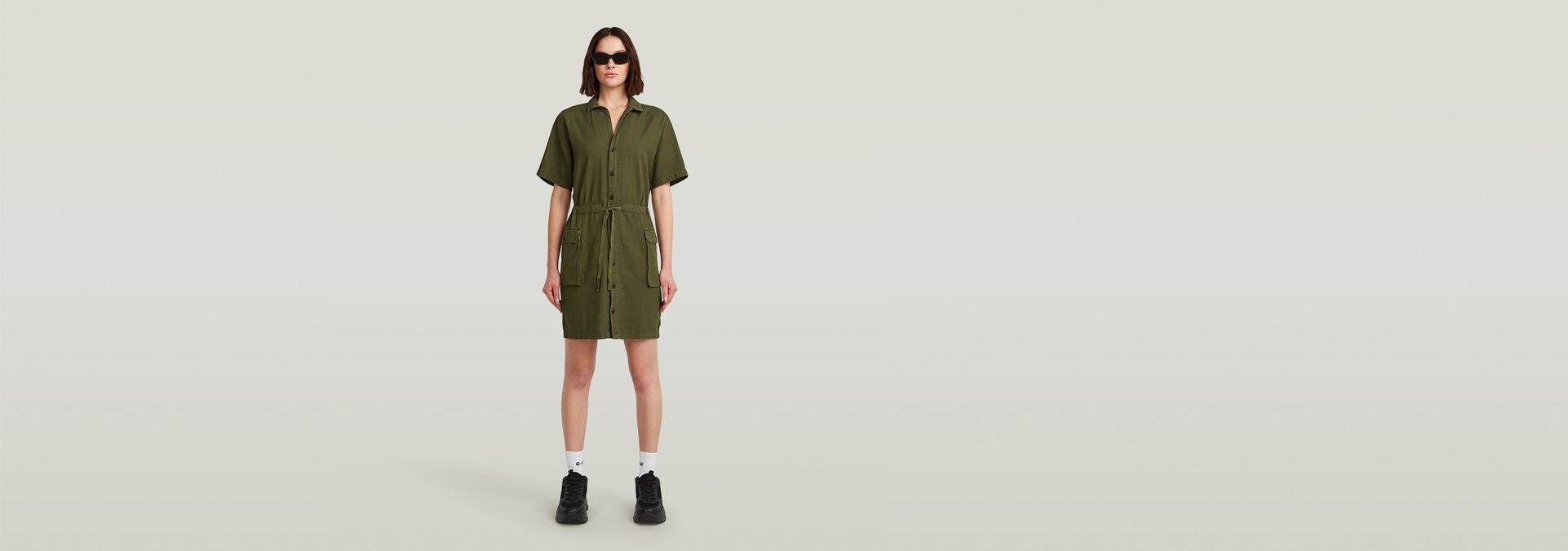 El vestido de manga corta Soft Utility tiene un corte ajustado, cierre de botones y cordón de ajuste para darle más forma. Los bolsillos con solapa de la cintura tienen un efecto 3D.