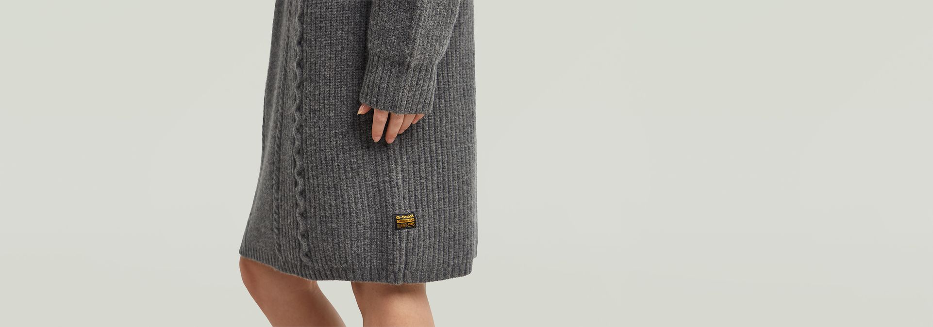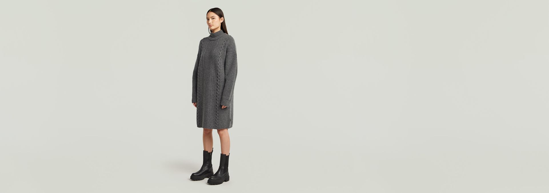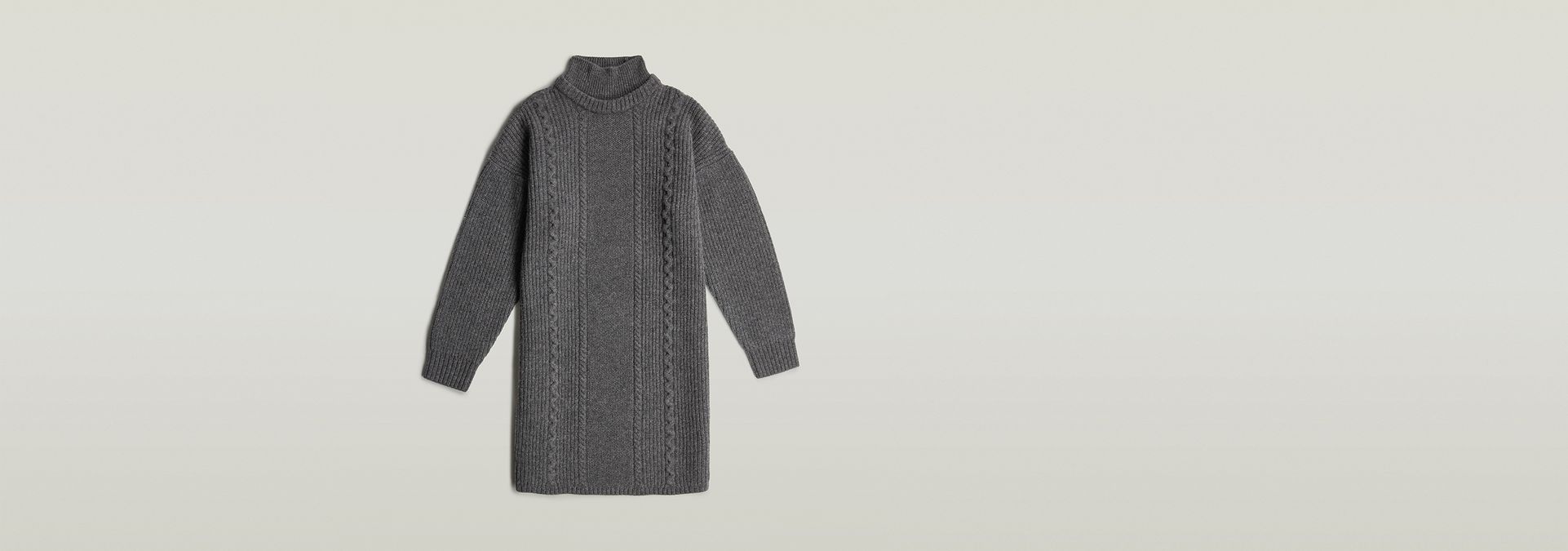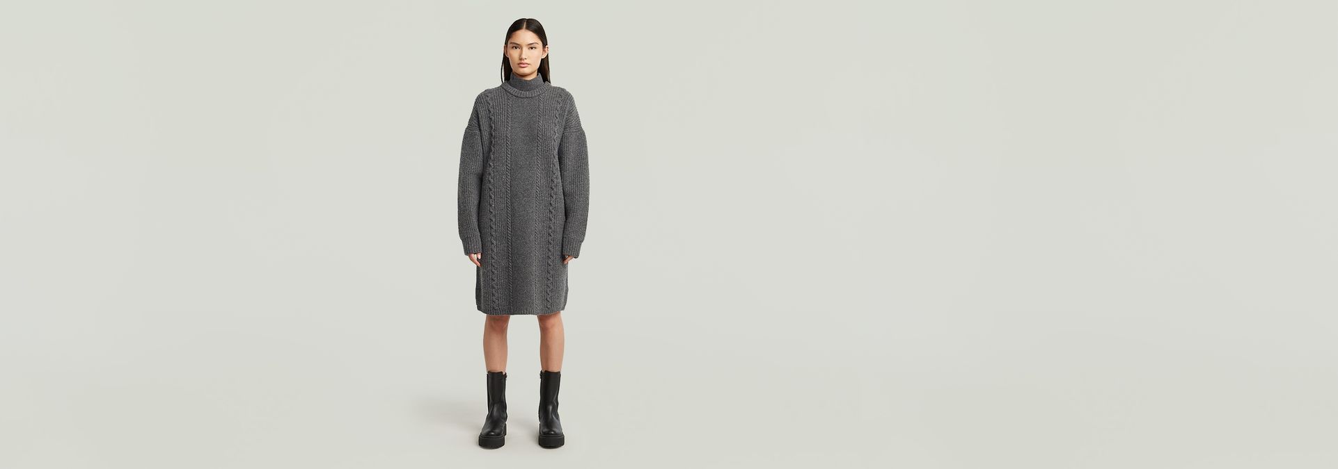 El vestido de punto Cable Loose tiene un corte relajado con cuello redondo y manga larga, perfecto para un look casual y elegante.